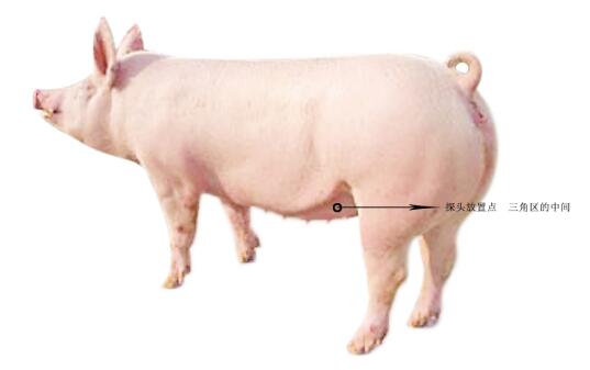 5、后備母豬測孕體位:母豬腹側(cè)后端倒數(shù)第1-2對乳頭乳頭上方、母豬乳基部起外側(cè)5-10cm之間,向?qū)γ嫦蚣棺?5°的方向來調(diào)整探視。
