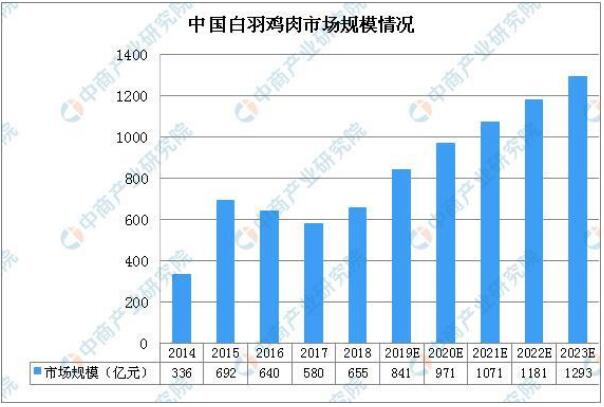 白羽雞肉主要是直接銷售,或進一步加工成對各類深加工雞肉制品。對環(huán)境的擔憂使得活肉雞的銷量減少,進而轉向冷凍/冷藏雞肉制品。按銷售收入劃分的白羽雞肉市場規(guī)模由2014年的836億元降至2018年的655億元,過去五年錄得的年復合增長率為-5.9%。就長期而言,隨著需求的增長及國內生產的恢復,預計市場將以14.6%的年復合增長率增長。