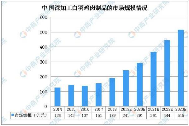 中國深加工白羽雞肉制品的市場規(guī)模從2014年的126億元增長到2018年的189億元,年復合增長率達10.8%。隨著更多元化產品組合的推出,再加上追求方便和多樣性的年青一代的追捧,預計總市場規(guī)模將在2018年到2023年間以22.2%的年復合增長率繼續(xù)穩(wěn)定增長。