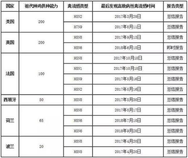 祖代種雞主要供種國(guó)高致病性禽流感現(xiàn)狀統(tǒng)計(jì)表