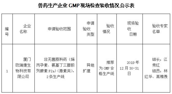 根據(jù)《獸藥生產(chǎn)質(zhì)量管理規(guī)范》的規(guī)定,依照農(nóng)業(yè)部第2262號(hào)公告公布的《獸藥生產(chǎn)質(zhì)量管理規(guī)范檢查驗(yàn)收辦法》,廳行政審批處派出的專家組對以下1家企業(yè)實(shí)施GMP的情況進(jìn)行現(xiàn)場檢查驗(yàn)收?,F(xiàn)將檢查情況在福建農(nóng)業(yè)信息網(wǎng)上予以公示,時(shí)間為2020年1月7日至2020年1月21日,請將意見和建議反饋給福建省農(nóng)業(yè)農(nóng)村廳行政服務(wù)中心。