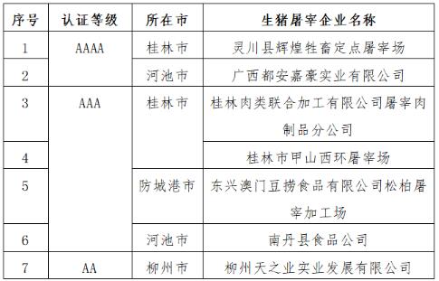廣西第四批生豬屠宰企業(yè)分級(jí)認(rèn)證名單