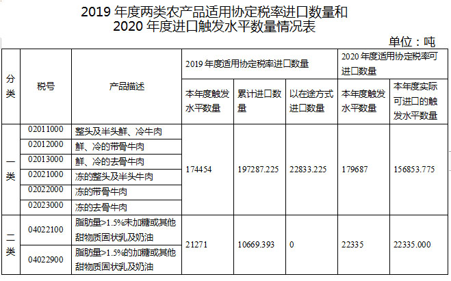 根據(jù)《中華人民共和國政府和澳大利亞政府自由貿(mào)易協(xié)定》和海關(guān)總署公告2019年第207號,我國對自澳大利亞進(jìn)口的兩類8個稅號農(nóng)產(chǎn)品(以下簡稱兩類農(nóng)產(chǎn)品)實(shí)施特殊保障管理措施?,F(xiàn)將2019年度兩類農(nóng)產(chǎn)品適用協(xié)定稅率進(jìn)口數(shù)量和2020年度進(jìn)口觸發(fā)水平數(shù)量予以公布。