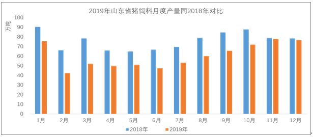 圖3 2019年山東省生豬飼料月度產(chǎn)量同2018年對(duì)比
