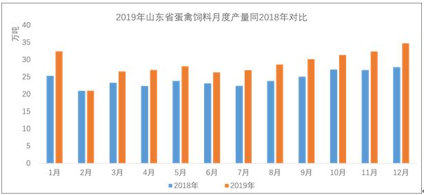 圖4 2019年山東省蛋禽飼料月度產(chǎn)量同2018年對(duì)比