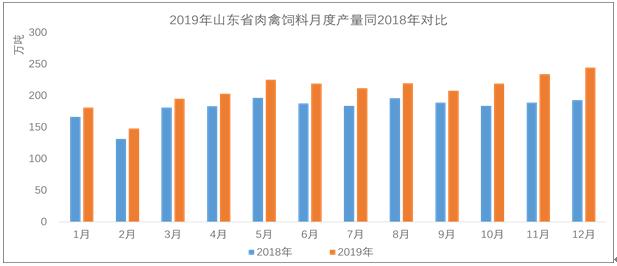 圖5 2019年山東省肉禽飼料月度產(chǎn)量同2018年對(duì)比