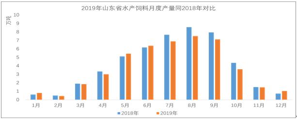 圖6 2019年山東省水產(chǎn)飼料月度產(chǎn)量同2018年對(duì)比