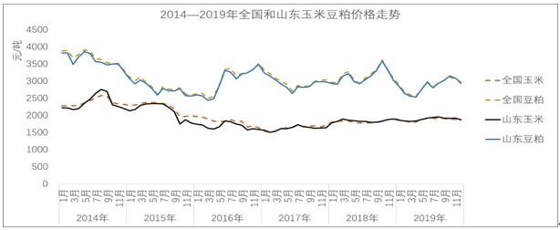 從原料價(jià)格來看,2019年全國(guó)玉米去庫存取得一定進(jìn)展,谷物及副產(chǎn)品進(jìn)口監(jiān)管趨嚴(yán),山東玉米價(jià)格呈現(xiàn)震蕩上漲的趨勢(shì),全年均價(jià)1893元/噸,同比上漲2.8%。中美貿(mào)易摩擦對(duì)豆粕的供需影響有限,在整體供大于求的局面下,2019年山東省全年豆粕均價(jià)2856元/噸,同比下降8.8%,山東省玉米和豆粕價(jià)格基本接近全國(guó)平均價(jià)格。