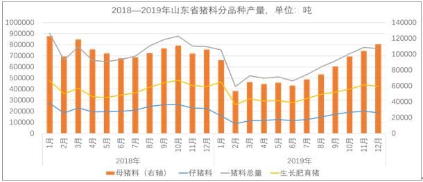 (二)生豬飼料先降后升據(jù)中國(guó)飼料工業(yè)統(tǒng)計(jì)系統(tǒng)顯示:2019年山東省生豬飼料產(chǎn)量722.9萬噸,同比下降20.6%。其中配合飼料產(chǎn)量624.8萬噸,同比下降21.2%;濃縮飼料產(chǎn)量81.8萬噸,同比下降16.4%;添加劑預(yù)混合飼料產(chǎn)量16.3萬噸,同比下降17.6%。