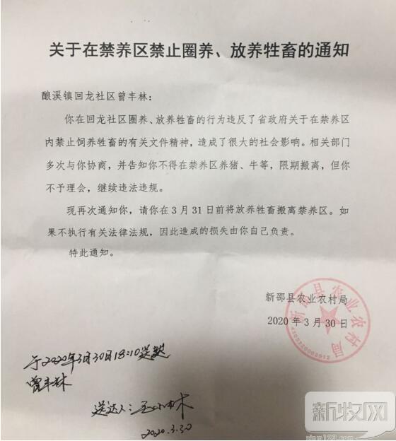3月30日晚,曾豐林稱他是2020年3月30日下班后收到了書面的《關(guān)于在禁養(yǎng)區(qū)禁止圈養(yǎng)、放養(yǎng)牲畜的通知》,根據(jù)他提供的圖片顯示,該通知上寫著于2020年3月30日18:10送達(dá)。該通知稱,曾豐林在回龍社區(qū)圈養(yǎng)、放養(yǎng)牲畜的行為違反了省政府關(guān)于在禁養(yǎng)區(qū)內(nèi)禁止飼養(yǎng)牲畜的有關(guān)文件精神,造成了很大的社會影響,要求于3月31日前將放養(yǎng)牲畜搬離禁養(yǎng)區(qū),如果不執(zhí)行有關(guān)法律法規(guī),因此造成的損失個(gè)人承擔(dān)。