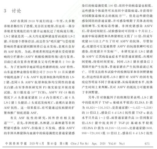 已知非洲的野豬、疣豬、叢林豬對ASF有天然抗性,可以感染但不發(fā)病。近期,《中國獸醫(yī)學報》報道發(fā)現(xiàn)一種對ASF有抗性的家豬品種。從大約克夏種豬選育而成的LS-2豬,不但整個群體存活,而且作為“哨兵豬”與受疫情影響的普通家豬同圈飼養(yǎng)后也未發(fā)病,表現(xiàn)出良好的ASF抗性——無死豬、不發(fā)病、對繁殖無影響。