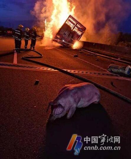 據(jù)駕駛員李某稱,他從山東出發(fā),運(yùn)豬前來寧波,在正常行駛中因?yàn)槎惚芤惠v變線小車急打了方向盤,車輛失控,一路剮蹭50多米邊護(hù)欄后才停了下來。油箱在剮蹭中出現(xiàn)了破損,又被剮蹭護(hù)欄濺起的火花點(diǎn)燃,由于火勢蔓延速度太快,自己沒法把車廂門打開,導(dǎo)致整車的活豬全部葬身火海,只活下來一頭。
