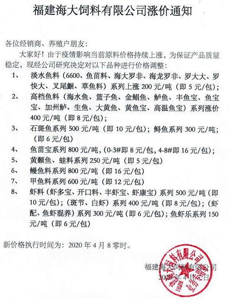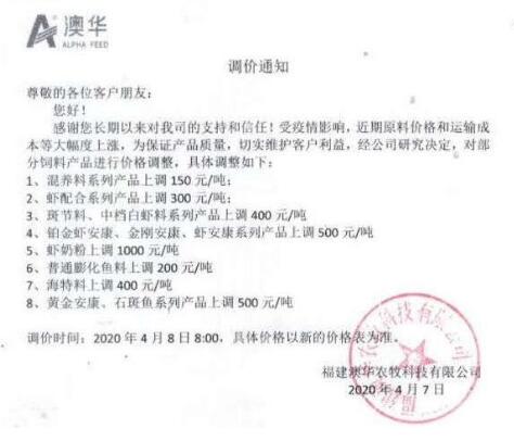 自2020年1月以來,魚粉、豆粕等飼料原料暴漲,為了保障公司產品質量和有效供應,經公司研究決定,自2020年4月7日凌晨開始,對公司產品進行價格調整,調整標準如下: