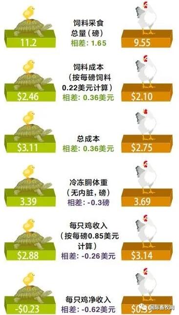 飼養(yǎng)慢生型肉雞與傳統(tǒng)肉雞的比較 數(shù)據(jù)來源:Anthony Pescatore