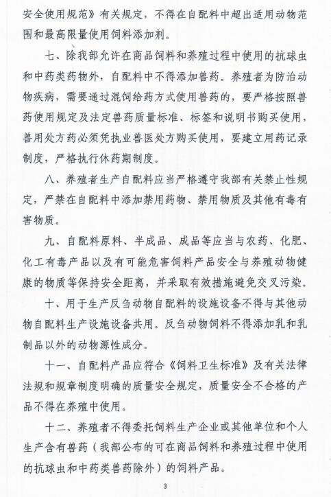 除當(dāng)?shù)赜袀鹘y(tǒng)使用習(xí)慣的天然植物原料(不包括藥用植物)及農(nóng)副產(chǎn)品外,不得使用農(nóng)業(yè)農(nóng)村部公布的《飼料原料目錄》《飼料添加劑品種目錄》以外的物質(zhì)生產(chǎn)自配料。