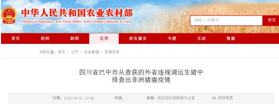 4月21日,農(nóng)業(yè)農(nóng)村部接到中國動(dòng)物疫病預(yù)防控制中心報(bào)告,經(jīng)四川省動(dòng)物疫病預(yù)防控制中心確診,在巴中市南江縣下兩高速出入口臨時(shí)動(dòng)物衛(wèi)生監(jiān)督檢查站查獲的1車外省違規(guī)調(diào)運(yùn)生豬中排查出非洲豬瘟疫情。查獲時(shí),該車共載有生豬106頭,死亡2頭。