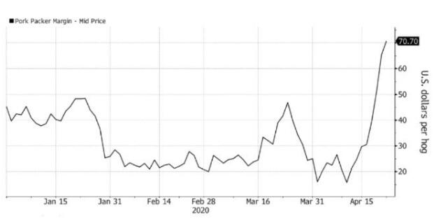 肉類加工廠的關(guān)閉使得全美生豬供應(yīng)嚴(yán)重過剩,生豬價(jià)格暴跌。