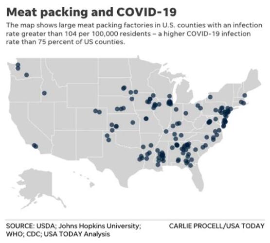 類似這種肉類加工廠關(guān)閉不是個(gè)案。媒體統(tǒng)計(jì)顯示,美國(guó)150個(gè)最大的肉類加工廠所在地均處于新冠疫情爆發(fā)的縣市。