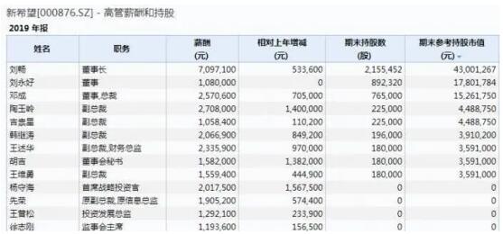 從持股市值維度上比較,新希望管理層持股數量也不多,除了劉永好、劉暢父女,僅有鄧成持股超過了1000萬元,相當于牧原股份一個副總的水平。