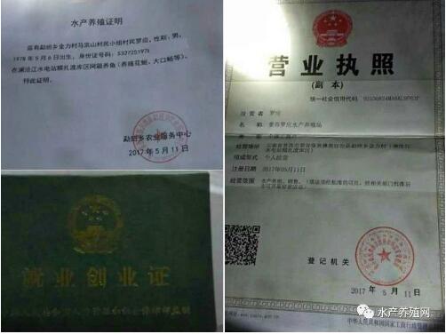 養(yǎng)殖戶(hù)羅應(yīng)的《水產(chǎn)養(yǎng)殖證明》、《就業(yè)創(chuàng)業(yè)證》、《營(yíng)業(yè)執(zhí)照》