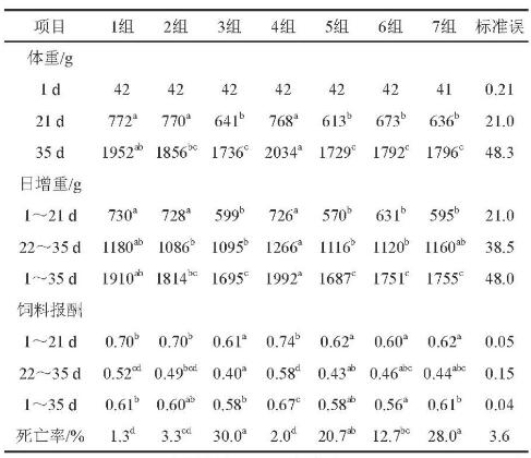表2試驗(yàn)日糧對(duì)肉雞生長性能和死亡率的影響