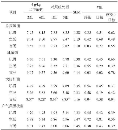 2.2 二甲酸鉀對(duì)感染壞死性腸炎肉雞組織器官微生物含量的影響