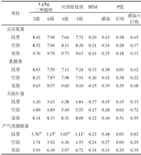3.2 二甲酸鉀對(duì)感染壞死性腸炎肉雞組織器官微生物含量的影響
