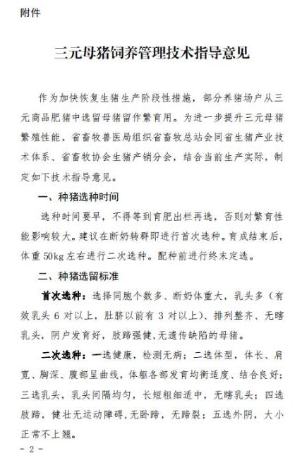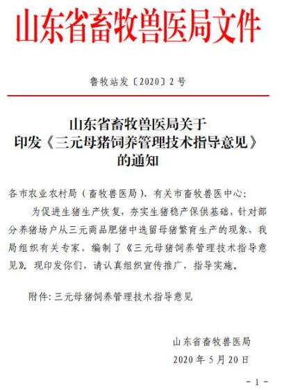 5月25日,為了促進(jìn)生豬生產(chǎn)恢復(fù),夯實(shí)生豬穩(wěn)產(chǎn)保供基礎(chǔ),山東省畜牧獸醫(yī)局編制了《三元母豬飼養(yǎng)管理技術(shù)指導(dǎo)意見》的通知。