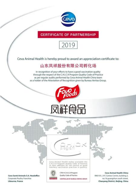 合作伙伴證書的頒發(fā)充分肯定和表彰了山東鳳祥股份有限公司在過去一年里嚴格落實必維國際檢驗集團認證的詩華C計劃的各項要求,確保了良好的孵化場免疫質(zhì)量。詩華C計劃在為客戶帶來更多價值的同時,也為孵化場免疫配套服務創(chuàng)立出新的、更高的行業(yè)標準,引領孵化場免疫新紀元!