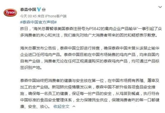 聲明稱,海關(guān)總署發(fā)布公告后,泰森中國立即進(jìn)行排查,確保泰森中國未曾從該禁止輸華企業(yè)進(jìn)口任何雞肉產(chǎn)品。泰森中國目前在中國市場銷售的雞肉產(chǎn)品,均來自國內(nèi)自有產(chǎn)業(yè)鏈,消費(fèi)者無論在任何正規(guī)渠道購買的泰森雞肉產(chǎn)品,均可通過產(chǎn)品標(biāo)簽識別產(chǎn)地。