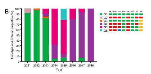 G4攻擊性的另一個(gè)體現(xiàn)在于,8年間,豬的患病率的確是在提升的,從2011年的1.4%逐年上升至2018年的8.21%。且2016年后,該病毒在豬群中大規(guī)模出現(xiàn),成為“在10個(gè)省的豬中檢測到的主要類型”,研究人員在論文中寫道。