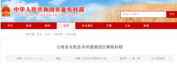 永勝縣非洲豬瘟疫情發(fā)生后,當(dāng)?shù)匕凑辗侵挢i瘟疫情應(yīng)急預(yù)案和非洲豬瘟防治技術(shù)規(guī)范要求,采取了封鎖、撲殺、消毒、無(wú)害化處理等措施。疫區(qū)內(nèi)應(yīng)撲殺生豬撲殺完成后,經(jīng)21天以上連續(xù)監(jiān)測(cè)排查,疫區(qū)內(nèi)未發(fā)現(xiàn)新的病例和監(jiān)測(cè)陽(yáng)性。麗江市農(nóng)業(yè)農(nóng)村局組織專家對(duì)永勝縣疫區(qū)進(jìn)行現(xiàn)場(chǎng)評(píng)估驗(yàn)收,驗(yàn)收結(jié)果符合關(guān)于疫區(qū)解除封鎖的有關(guān)規(guī)定,當(dāng)?shù)卣綄?duì)疫區(qū)解除封鎖。農(nóng)業(yè)農(nóng)村部要求當(dāng)?shù)匦竽莲F醫(yī)部門(mén)繼續(xù)加強(qiáng)疫情監(jiān)測(cè)排查,采取積極的防控措施,防止非洲豬瘟疫情再次發(fā)生。
