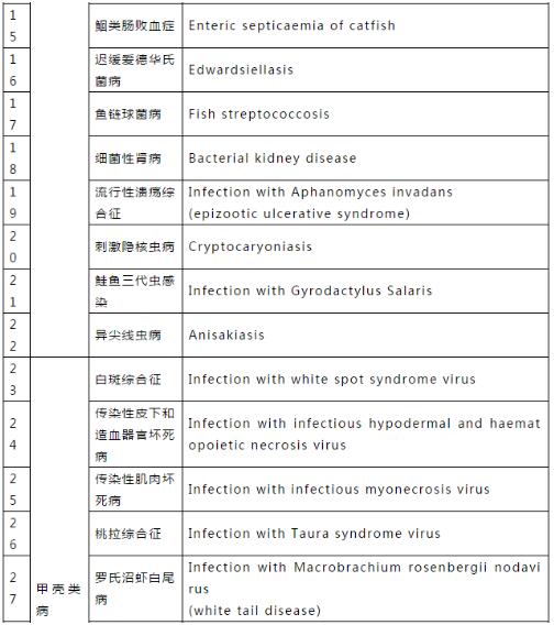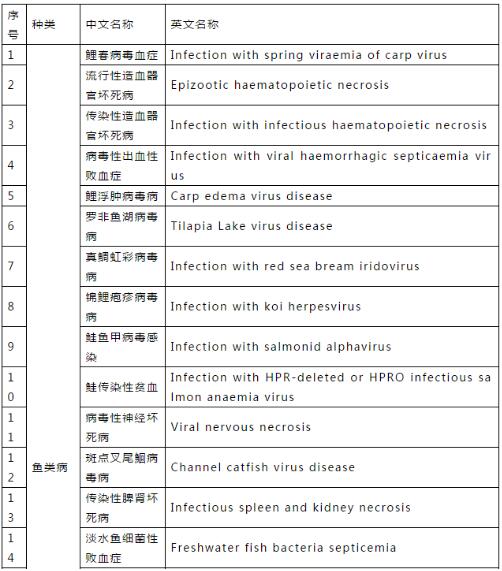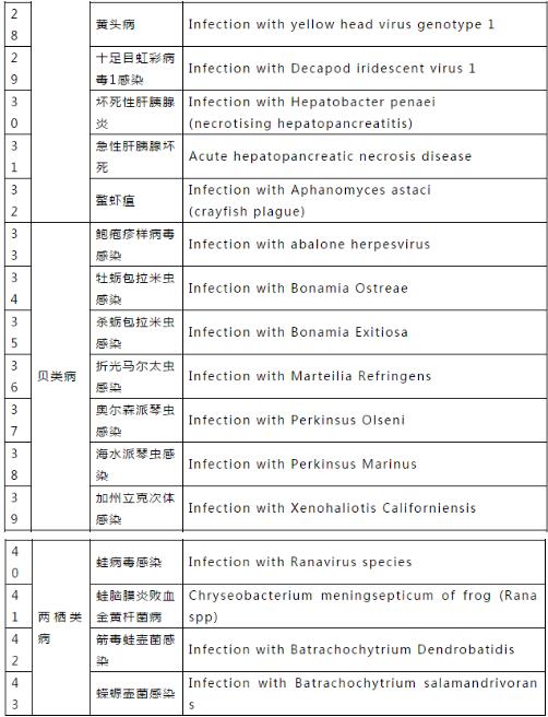 修訂后的《名錄》,包括水生動(dòng)物疫病43種,均被列為二類進(jìn)境疫病。新增了7種水生動(dòng)物疫病,分別為:鮭魚(yú)甲病毒感染、鯉浮腫病毒病、羅非魚(yú)湖病毒病、細(xì)菌性腎病、急性肝胰腺壞死、十足目虹彩病毒1感染(蝦虹彩病毒?。┖拖旙⒒【腥?;刪除了8種水生動(dòng)物疫病,分別為:對(duì)蝦桿狀病毒病、斑節(jié)對(duì)蝦桿狀病毒病、小瓜蟲(chóng)病、黏孢子蟲(chóng)病、 指環(huán)蟲(chóng)病、河蟹顫抖病 、鮑膿皰病和鱉腮腺炎病。
