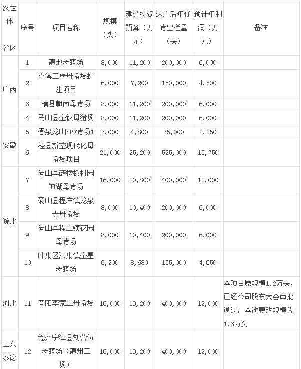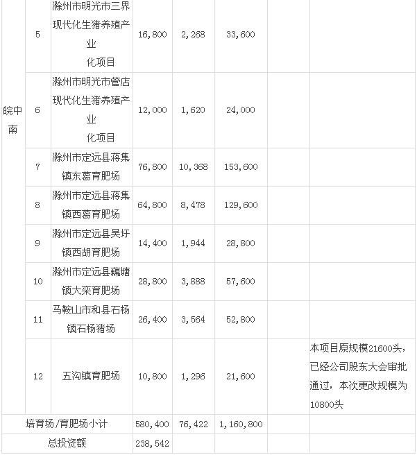根據(jù)公告,本次規(guī)劃建設(shè)的項(xiàng)目包括建造(含改造)西式母豬場12個(gè),公豬站2個(gè),育肥場(培育場)12個(gè),合計(jì)26個(gè)項(xiàng)目。項(xiàng)目實(shí)施地均為公司規(guī)劃中的資源優(yōu)勢區(qū)域和重點(diǎn)養(yǎng)殖發(fā)展區(qū)域,項(xiàng)目總投資23.85億元,其中包含母豬場固定資產(chǎn)投資15.95億元,配套公豬站投資2640萬元、配套育肥場(培育場)投資7.64億元。
