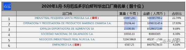據(jù)海關(guān)數(shù)據(jù)顯示:2020年1-5月,厄瓜多爾對華出口廠商中,桑塔排名第一。1-5月厄瓜多爾白蝦到港總量為15.49萬噸,到港總金額為60億元。其中,桑塔占總比22.74%,藍(lán)泰占比4.16%。