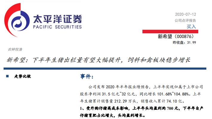 事件:公司發(fā)布2020年半年報(bào)業(yè)績(jī)預(yù)告,上半年實(shí)現(xiàn)歸屬于上市公司股東凈利潤(rùn)31.5億元~32億元,同比增長(zhǎng)101.68%~104.88%。上半年生豬累計(jì)銷(xiāo)售量212.29萬(wàn)頭,銷(xiāo)售收入累計(jì)74.10億。