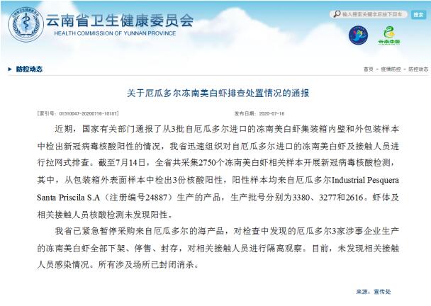截至7月14日,全省共采集2750個凍南美白蝦相關樣本開展新冠病毒核酸檢測,其中,從包裝箱外表面樣本中檢出3份核酸陽性,陽性樣本均來自厄瓜多爾Industrial Pesquera Santa Priscila S.A(注冊編號24887)生產(chǎn)的產(chǎn)品,生產(chǎn)批號分別為3380、3277和2616。蝦體及相關接觸人員核酸檢測未發(fā)現(xiàn)陽性。