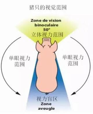 人類的視網(wǎng)膜上分布著三種視錐細(xì)胞,因此人類的三色光感使其能夠分辨光譜上大部分顏色。豬只和大部分哺乳動(dòng)物一樣屬于兩色光感動(dòng)物,他們區(qū)分顏色的能力更弱一些。在所有顏色中,豬只能夠分辨出黑色、灰色、白色、藍(lán)色、紅色和棕色,而他們分辨不出綠色、黃色和橘色。因此紅色的趕豬板比綠色的作用更大。同樣的道理,身穿藍(lán)色工作服的飼養(yǎng)員比穿綠色的飼養(yǎng)員更好操作豬群。兩色光感視力的特點(diǎn)也使動(dòng)物對(duì)突然的移動(dòng)行為更加敏感。飼養(yǎng)員在操作豬群時(shí)應(yīng)該盡量緩慢,留一定時(shí)間給豬只與同伴交流接觸。實(shí)驗(yàn)研究表明,飼養(yǎng)員粗魯?shù)男袨榻o豬只帶來(lái)的恐懼,和人類觸電時(shí)產(chǎn)生的恐懼一樣。比如飼養(yǎng)員突然闖進(jìn)圈內(nèi)拉出死尸的操作對(duì)豬群來(lái)說(shuō)就是非常暴力的行為,而對(duì)于人類來(lái)說(shuō)卻是無(wú)關(guān)痛癢的行為。這樣會(huì)使豬只接下來(lái)對(duì)人產(chǎn)生恐懼并想遠(yuǎn)離的感覺(jué),即使他們表現(xiàn)出來(lái)的是靜立不動(dòng)。