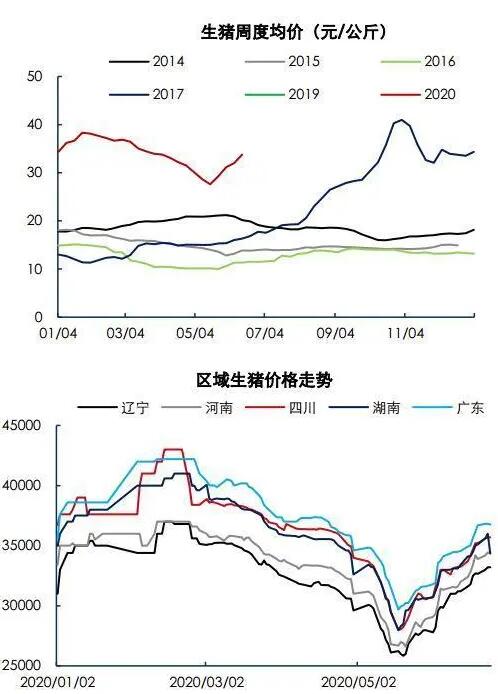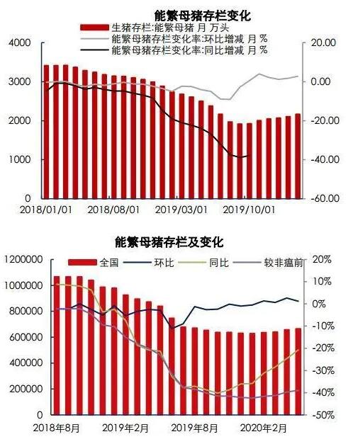 母豬存欄環(huán)比連續(xù)回升,產(chǎn)能開啟恢復。農(nóng)業(yè)農(nóng)村部數(shù)據(jù)顯示,5月份能繁母豬存欄環(huán)比增長3.9%,同比下降5%,較非瘟前下降25%;涌益資訊樣本數(shù)據(jù)顯示2020年5月樣本企業(yè)能繁母豬存欄665359萬頭,環(huán)比增加1.21%,同比減少20.71%,較非瘟前下降38.96%。從生豬的養(yǎng)殖周期推,正常年份能繁母豬存欄增長對應10個月后生豬出欄的增加。按照10個月周期計算,預計生豬出欄在2020年8月開始穩(wěn)步增長。考慮今年生豬出欄均重增加,養(yǎng)殖周期同比,對應調(diào)整按11個月計算,預計2020年9月出欄開始增加。