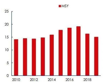 MSY下降獲致產(chǎn)能恢復速度低于預期。MSY代表母豬的生產(chǎn)效率,即能繁母豬一年能夠提供的出欄肥豬數(shù)量。計算MSY有兩種方式:即直接法和倒推法。直接法:MSY=PSY×育肥豬成活率(注:PSY是指每頭母豬每年所能提供的斷奶仔豬頭數(shù),是衡量豬場效益和母豬繁殖成績的重要指標)。倒推法:2020年MSY=2020年生豬出欄量÷(2019年3月能繁母豬量-2020年2月能繁母豬量)
