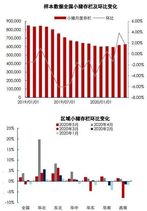 當前小豬存欄量對應6個月后生豬出欄供應,根據(jù)涌益資訊的樣本企業(yè)數(shù)據(jù)顯示,2020年1月、2月、3月仔豬存欄環(huán)比變化幅度分別為-0.91%、-1.14%、-1.13%,按照生長周期推算,三季度生豬出欄數(shù)據(jù)環(huán)比持續(xù)下降。4月、5月仔豬存欄數(shù)據(jù)環(huán)比變化為0.67%、2.84%,可推四季度生豬出欄逐漸增加,且增速加快。