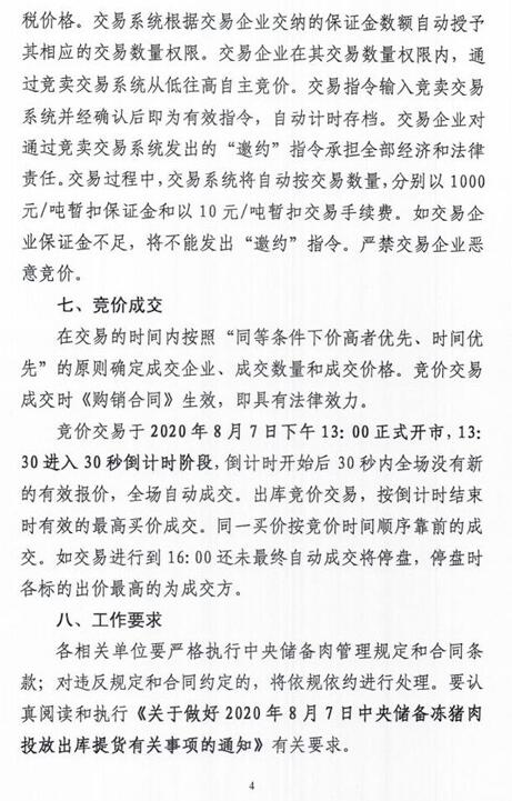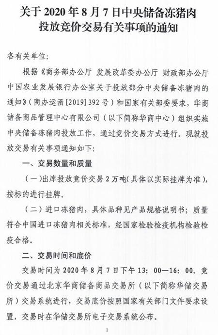 華儲(chǔ)網(wǎng)8月4日發(fā)布中央儲(chǔ)備凍豬肉投放競價(jià)交易有關(guān)事項(xiàng)的通知,將競價(jià)交易2萬噸,交易時(shí)間為2020年8月7日下午13時(shí)至16時(shí),這是今年以來第26批投放的中央儲(chǔ)備凍豬肉,累計(jì)投放量將達(dá)49萬噸。
