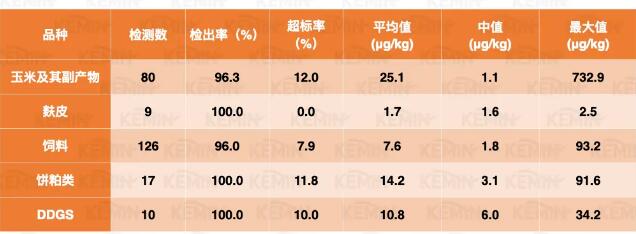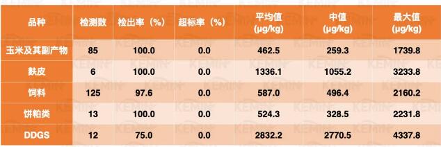 參考我國《飼料衛(wèi)生標(biāo)準(zhǔn)》(GB13078-2017)制定的毒素限量標(biāo)準(zhǔn),我們將毒素含量低于一半限量標(biāo)準(zhǔn)的樣品判定為輕度污染,高于一半限量標(biāo)準(zhǔn)但低于限量標(biāo)準(zhǔn)的樣品判定為中度污染,高于限量標(biāo)準(zhǔn)的樣品定為重度污染,即超標(biāo)污染(以下判定類同)。