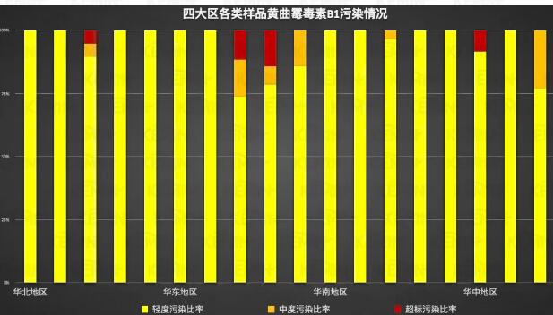 從圖3可以看出,四大區(qū)均出現(xiàn)黃曲霉毒素B1中度或以上污染。華東地區(qū)的飼料樣品中黃曲霉毒素B1中度及以上污染比例最高,達(dá)到26.3%,該地區(qū)餅粕類和DDGS原料黃曲霉毒素B1中度污染及以上污染比率分別為21.4% 和14.3%,推測是該區(qū)域飼料中黃曲霉毒素B1污染與這兩種原料有一定關(guān)聯(lián);華中地區(qū)玉米及其副產(chǎn)物超標(biāo)污染率達(dá)到8.3%,可能是導(dǎo)致該區(qū)飼料黃曲霉毒素B1出現(xiàn)較高比例(23.1%)的中度污染的原因之一。華北地區(qū)飼料黃曲霉毒素B1超標(biāo)污染率和中度污染率均為5.3%;華南地區(qū)各類樣品整體黃曲霉毒素B1污染程度較低。