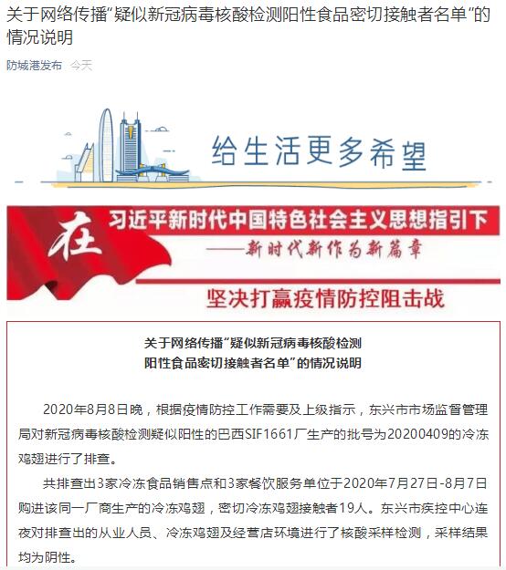 據(jù)防城港發(fā)布微信號9日消息,2020年8月8日晚,根據(jù)疫情防控工作需要及上級指示,東興市市場監(jiān)督管理局對新冠病毒核酸檢測疑似陽性的巴西SIF1661廠生產(chǎn)的批號為20200409的冷凍雞翅進(jìn)行了排查。