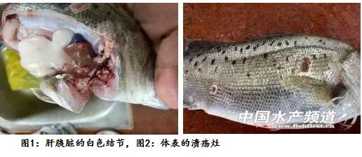 主要癥狀:瀕死魚離群獨游,體色變淡,部分魚體表有大小不等的潰瘍灶,打開腹腔可見肝胰臟、脾臟,腎臟有大小不等的白色結(jié)節(jié)。