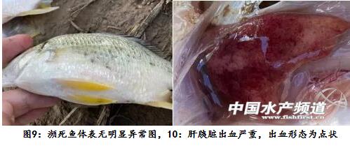 主要癥狀:瀕死魚離群獨游,體色變淡,外觀無明顯異常,打開腹腔可見少量無色透明腹水,肝胰臟點狀出血,腹腔膜點狀出血,胃腸道無食物,腸道沒有膿液。