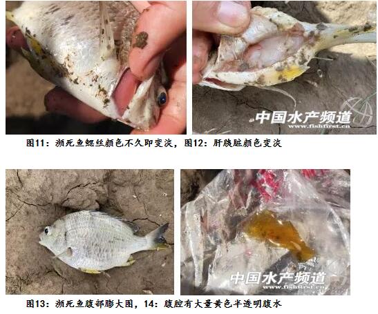 主要癥狀:瀕死魚離群獨游(數(shù)量較多),腹部膨大,眼球突出,鰓絲鮮紅(拿出水面不久即變成暗紅),體表粘液脫落,顏色變淡,解剖瀕死魚,可見腹腔有大量黃色腹水,肝胰臟色淡變黃,腸道有膿。