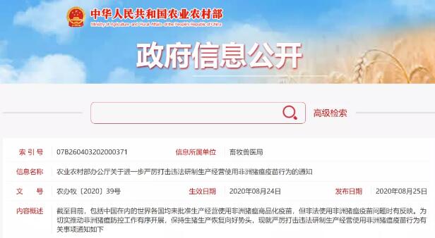 各省級畜牧獸醫(yī)主管部門要及時總結(jié)打擊違法研制生產(chǎn)經(jīng)營使用非洲豬瘟疫苗行為進(jìn)展情況,并于11月30日前將相關(guān)工作情況報送我部畜牧獸醫(yī)局。