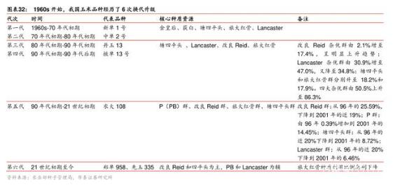從1960s玉米單交種育種開始,我國玉米種業(yè)共經(jīng)歷了六次品種變革,代表品種分別為第一代的新單1號(hào)、白單1號(hào)、白單2號(hào)、白單4號(hào)、吉單101等,第二代的中單2號(hào)、鄭單2號(hào)、丹玉6號(hào)等,第三代的丹玉13、煙單14、掖單2號(hào)、四單8號(hào)等,第四代的掖單13、掖單12號(hào)等,第五代的農(nóng)大108、豫22、魯單50等,以及第六代的鄭單958、先玉335等,通常每一次品種換代都伴隨著大品種(年推廣面積1000畝以上)地出現(xiàn)。